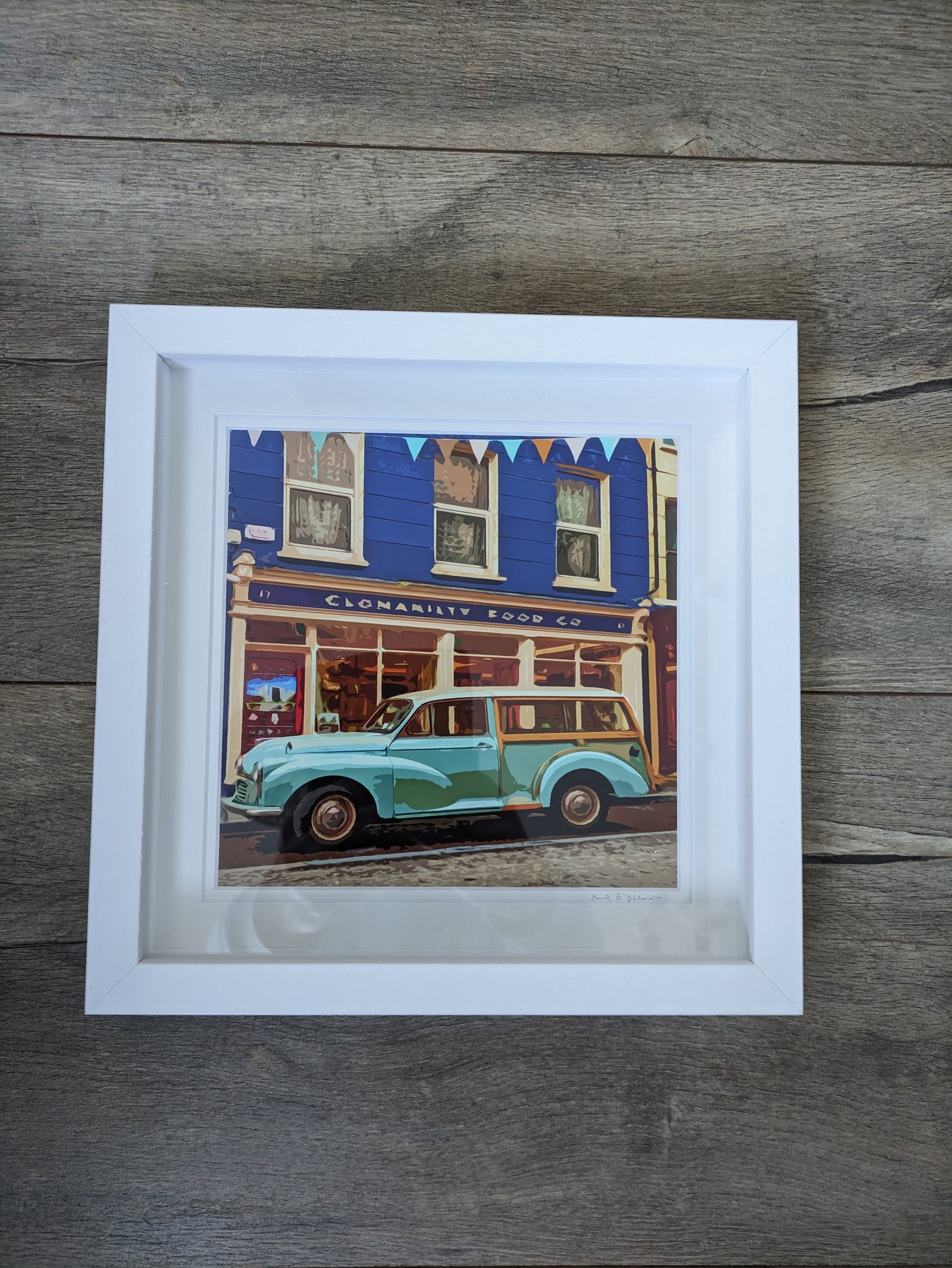 A vibrant, colourful photographic print capturing the charm of Clonakilty's Old Town Fair, held every summer in the heart of West Cork, Ireland. This artistic print features a classic Morris estate car positioned in front of the Clonakilty Food Co. premises, celebrating one of the town's most beloved annual events.